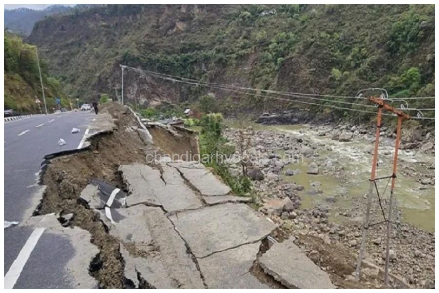 मंडी में फोरलेन पर डंगा ढहा, 30 मीटर सड़क क्षतिग्रस्त, घरों पर मंडराया खतरा