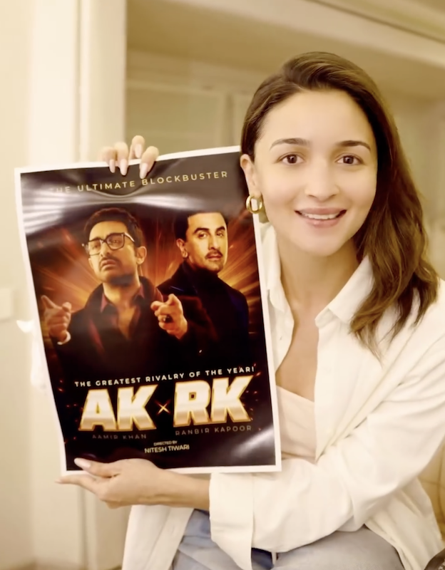 आलिया भट्ट ने जो पोस्टर शेयर किया है, उसमें आमिर और रणबीर की तस्वीरों के साथ लिखा है, 'अल्टीमेट ब्लॉकबस्टर'। साथ ही निर्देशक के रूप मेंनितेश तिवारी का नाम है। फैंस जानना चाह रहे हैं कि क्या यह कोई नई फिल्म है। दरअसल, आलिया ने कैप्शन में हैशटैक के साथ एड (#ad) भीलिखा है। ऐसे में सवाल ये भी है कि क्या दोनों सुपरस्टार्स किसी विज्ञापन में साथ नजर आने वाले हैं।