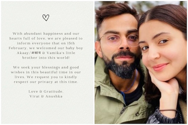 किंग कोहली एक बार फिर पिता बन गए हैं। इस बात की जानकारी पूर्व कप्तान ने मंगलवार को अपने सोशल मीडिया के जरिएदी। बल्लेबाज विराट कोहली ने अपने इंस्टा हैंडल से बताया कि 15 फरवरी को उनकी पत्नी ने बेटे को जन्म दिया जिसका नाम'अकाय' रखा गया है। विराट ने इस पोस्ट में लिखा, "हमें यह बताते हुए अत्यधिक खुशी हो रही है कि 15 फरवरी को हमने अपनेबेटे अकाय और वामिका के छोटे भाई का इस दुनिया में स्वागत किया है। हमने अपने जीवन के इस खूबसूरत समय में आपकाआशीर्वाद और शुभकामनाएं चाहते हैं। हम आपसे अनुरोध करते हैं कि हमारी प्राइवेसी का सम्मान करें।"