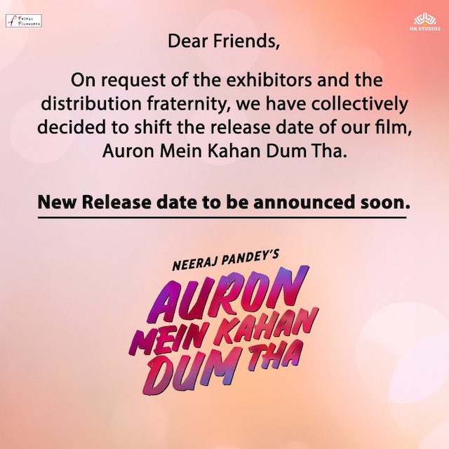 अजय देवगन और तब्बू की फिल्म 'औरों में कहां दम था' के मेकर्स ने बीती देर शाम सोशल मीडिया पर स्टेटमेंट जारी करकेफिल्म के पोस्टपोन होने की जानकारी दी है. औरों में कहां दम था के मेकर्स ने स्टेटमेंट में बताया- 'डियर फ्रेंड्स, एक्सीबिटर्स औरडिस्ट्रीब्यूशन फ्रेटर्निटी की रिक्वेस्ट पर, हमने एकसाथ हमारी फिल्म औरों में कहां दम था को आगे खिसकाने का फैसला लिया है. नई डेट जल्द ही अनाउंस की जाएगी.'