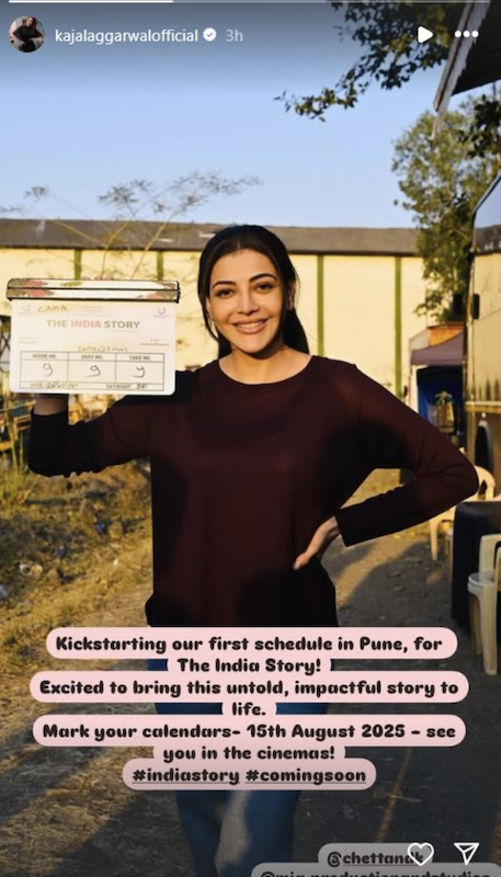 काजल अग्रवाल की बहुप्रतीक्षित फिल्म द इंडिया स्टोरी की शूटिंग इस हफ्ते से शुरू हो गई है, और फैंस के बीच उत्साह का माहौल है। अभिनेत्री ने अपने इंस्टाग्राम पर फिल्म के सेट से एक तस्वीर शेयर की, जिसमें वह क्लैपरबोर्ड थामे हुए नजर आ रही हैं। तस्वीर के साथ उन्होंने लिखा, "पुणे में दइंडिया स्टोरी की हमारी पहली शेड्यूल की शुरुआत कर रही हूं! इस अनकहे और प्रभावशाली कहानी को जीवन में लाने के लिए उत्साहित हूं। अपनीकैलेंडर पर तारीख डालें - 15 अगस्त 2025 - सिनेमाघरों में मिलते हैं! #indiastory #comingsoon।"