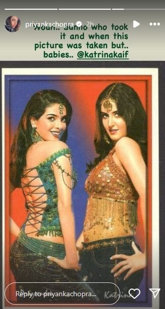 प्रियंका चोपड़ा ने अपने सोशल मीडिया अकाउंट पर एक पुरानी फोटो अपनी इंस्टाग्राम स्टोरी पर शेयर की है। इस फोटो में प्रियंका के साथ कैटरीनाकैफ भी नजर आ रही हैं। प्रियंका ने बॉलीवुड में अपने पुराने दिनों को याद करते हुए यह तस्वीर इंस्टाग्राम स्टोरी पर शेयर की है। इस तस्वीर के साथप्रियंका ने लिखा, ''पता नहीं इस तस्वीर को किसने लिया था और कब यह तस्वीर ली गई थी।'' प्रियंका और कैटरीना की यह तस्वीर सोशल मीडियापर वायरल हो गई है।