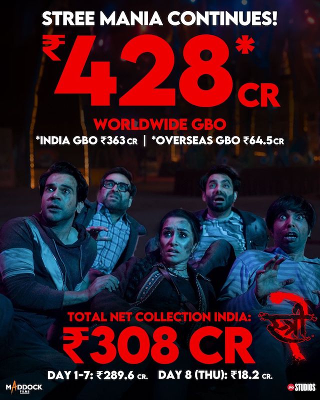 स्त्री 2: सरकटे का आतंक’ने 15 अगस्त 2024 को दुनिया भर में रिलीज़ होने के बाद से बॉक्स ऑफिस पर धमाल मचा दिया है। अमर कौशिक द्वारा निर्देशित और नीरेन भट्ट द्वारा लिखित इस फिल्म को आलोचकों और दर्शकों से समान रूप से शानदार समीक्षा मिली है।इसने 428 करोड़ की शानदार कमाई की है, जिससे यह 2024 की दूसरी सबसे ज़्यादा कमाई करने वाली भारतीय फिल्म और साल कीसबसे ज़्यादा कमाई करने वाली हिंदी फिल्म बन गई है।