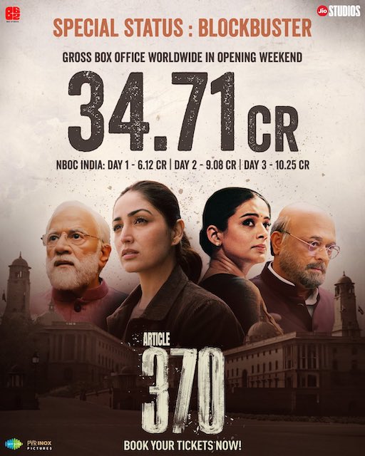 34.71 करोड़ के 3 दिन के कलेक्शन के साथ, 'आर्टिकल 370' ने हाल ही में रिलीज हुई कई फिल्मों को पीछे छोड़ दिया है।फिल्म ऑस्ट्रेलिया, न्यूजीलैंड, यूके, यूएसए और कनाडा जैसे विदेशी केंद्रों में भी बहुत अच्छा प्रदर्शन कर रही है, जो फिल्म में गहरी रुचि का संकेत देती है।