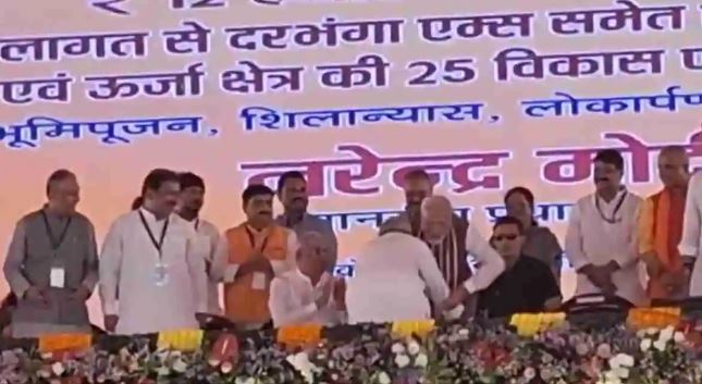 दरभंगा में एक कार्यक्रम में एक आश्चर्यजनक क्षण में, बिहार के मुख्यमंत्री नीतीश कुमार ने प्रधान मंत्री नरेंद्र मोदी के पैर छूने की कोशिश की, यह वीडियो में कैद हो गया और सोशल मीडिया पर व्यापक रूप से प्रसारित हुआ। फुटेज में 73 साल के नीतीश कुमार 74 साल के पीएम मोदी के पास आते हैं और हाथ जोड़कर सम्मान में झुकते हैं। हालाँकि, पीएम मोदी तुरंत उन्हें रोकते हैं और हाथ मिलाने की पेशकश करते हैं। इस साल यह तीसरी बार है जब नीतीश कुमार ने प्रधानमंत्री की ओर ऐसा इशारा किया है, जून में संसद के सेंट्रल हॉल में और इससे पहले अप्रैल में लोकसभा रैली में इसी तरह के उदाहरण सामने आए थे।
