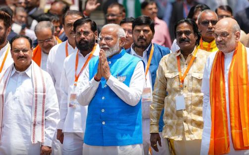 दिल्ली में भाजपा मुख्यालय से राष्ट्र को संबोधित करते हुए, जब यह स्पष्ट हो गया कि पार्टी एनडीए सहयोगियों के बहुत जरूरी समर्थन के साथ नई सरकार बनाएगी, प्रधानमंत्री नरेंद्र मोदी ने मतदाताओं का आभार जताया और कहा, "आज की जीत दुनिया के सबसे बड़े लोकतंत्र की जीत है।"प्रधानमंत्री जवाहरलाल नेहरू के बाद मोदी तीसरी बार सत्ता में आने वाले दूसरे नेता होंगे और उन्होंने अगले पांच साल में बदलाव लाने का वादा किया है। उनके नेतृत्व में, भारत दुनिया की सबसे तेजी से बढ़ती प्रमुख अर्थव्यवस्था बन गया है और उन्होंने कहा है कि वह इसे तीन साल में संयुक्त राज्य अमेरिका और चीन के बाद दुनिया की तीसरी सबसे बड़ी अर्थव्यवस्था बनाना चाहते हैं।