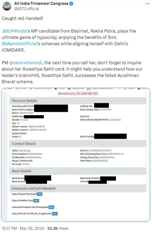 उन्होंने कहा, रेखा को गरीब दर्शाने के लिए ऐसा किया गया। क्योंकि उसे राज्य सरकार की स्वास्थ्य योजना, स्वास्थ्य सारथी और दुआरे सरकार योजना का लाभ मिलता है। रेखा का मजाक उड़ाया गया है। पार्टी ने कहा है कि टीएमसी सरकारी योजनाओं के लाभार्थियों का डेटा का गलत उपयोग कर रही है। AITC और उसके पदाधिकारियों ने रेखा पात्रा के निजता के अधिकार का उल्लंघन किया गया है। इसके अलावा AITC का सरकारी डेटा एक्सेस करना डिजिटल पर्सनल डेटा प्रोटेक्शन एक्ट 2023 के प्रावधान का उल्लंघन है। पत्र में आगे कहा गया कि यह आदर्श आचार संहिता लागू होने के साथ चुनाव कानूनों का उल्लंघन है। निजता के संवैधानिक अधिकार का उल्लंघन और IPC की धारा 499 और 500 के अनुसार मानहानि का मामला है। आपको बता दें, रेखा पात्रा संदेशखाली कांड की पीड़ित हैं। उन्हें बीजेपी ने बशीरहाट लोकसभा सीट से पार्टी का उम्मीदवार बनाया है।