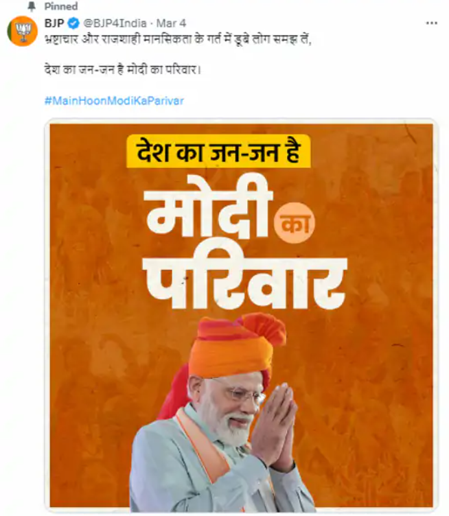 दरअसल, पटना में 3 मार्च को महागठबंधन की रैली में लालू यादव ने कहा था कि PM परिवारवाद पर हमला करते हैं, लेकिन उनका अपना परिवार नहीं है। इसी के जवाब में भाजपा ने X पर पोस्ट किया, हर किसी से अपनापन, हर किसी से सरोकार तभी तो 140 करोड़ देशवासी हैं, PM मोदी का परिवार। इसके बाद भाजपा नेताओं ने अपने X प्रोफाइल पर नाम के आगे मोदी का परिवार लिखना शुरू कर दिया। 4 मार्च को भाजपा ने लालू यादव के बयान पर जवाब देते हुए कहा था कि भ्रष्टाचार और राजशाही मानसिकता के गर्त में डूबे लोग समझ लें कि देश का जन जन मोदी का परिवार है। प्रधानमंत्री मोदी ने तेलंगाना में सोमवार को आरजेडी चीफ लालू प्रसाद यादव के परिवार वाले बयान का जवाब दिया था। उन्होंने कहा था, इन्हें बताना चाहता हूं कि मेरा देश, 140 करोड़ देशवासी मेरा परिवार हैं। मैं जब भी परिवारवाद की राजनीति की बात करता हूं, तो विपक्ष के लोग कहते हैं कि मोदी का तो कोई परिवार ही नहीं है। उन्होंने कहा कि देशवासियों के लिए बचपन में घर छोड़ा था, इन्हीं के लिए जीवन खपा दूंगा। PM की स्पीच के कुछ देर बाद ही भाजपा नेताओं अमित शाह, जेपी नड्डा, स्मृति ईरानी, ज्योतिरादित्य सिंधिया, शिवराज सिंह चौहान और किरेन रिजिजू जैसे बड़े नेताओं ने प्रोफाइल नेम चेंज कर दिया।