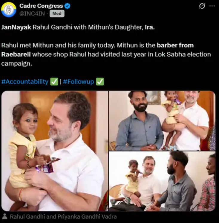 राहुल गांधी ने मिथुन की पत्नी सीता से नमस्ते कर उनका हालचाल जाना और बेटी शिवांशी को करीब 15 मिनट तक गोद में बैठाए रखा। खुद अपने हाथों से चॉकलेट का रैपर फाड़ कर बच्ची को खिलाया। 13 मई 2024 को राहुल गांधी के लालगंज दौरे के दौरान वे अचानक मिथुन की सैलून पहुंचे थे, जहां उन्होंने बाल और दाढ़ी कटवाकर सबको चौंका दिया था। इसी घटना के बाद मिथुन चर्चा में आ गए थे। राहुल गांधी की टीम की ओर से उन्हें हेयर कटिंग चेयर, शैंपू चेयर और इन्वर्टर-बैटरी जैसी चीजें भेंट की गईं, जिससे उनकी दुकान को नया रूप मिला। राहुल गांधी ने शेविंग और हेयर कटिंग के बदले में मिथुन को 500 रुपए दिए थे। बातचीत के दौरान राहुल ने उनसे उनकी दुकान पर सबसे पॉपुलर हेयर स्टाइल के बारे में पूछा था। इस मुलाकात का वीडियो भी राहुल गांधी ने सोशल मीडिया पर साझा किया था। मिथुन ने उस समय कहा था कि उन्होंने सपने में भी नहीं सोचा था कि एक दिन राहुल गांधी जैसी शख्सियत उनके सैलून में आएंगी। इस मुलाकात के बाद मिथुन की लोकप्रियता बढ़ी, दुकान की कमाई में इजाफा हुआ और ग्राहक भी लगातार आने लगे। आज वह अच्छी दुकानदारी कर रहे हैं और उनके सैलून में भीड़ लगी रहती है।