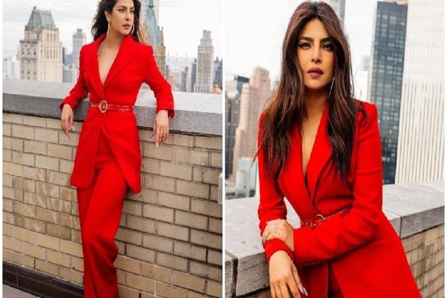 प्रियंका चोपड़ा का रेड पैंटसूट लुक कियारा के थ्योरी के करीब है, लेकिन टेलरिंग और बेल्ट से फर्क पड़ता है। उसने भी अपने बालों को खुला छोड़ दिया और बड़े सुनहरे हुप्स के साथ एक्सेसराइज़ किया।