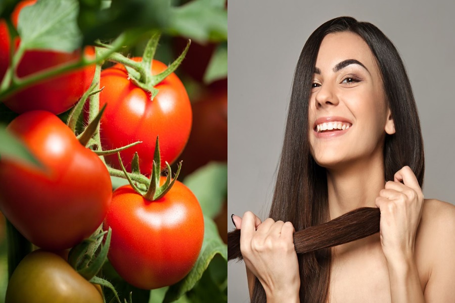 टमाटर पोषक तत्वों का एक भंडार है जो स्वस्थ बालों के विकास को बढ़ावा दे सकता है। इनमें विटामिन और मिनरल भरपूर मात्रा में होते हैं, जो स्कैल्प को पोषण देते हैं और बालों के रोम को स्वस्थ रखते हैं। इसके अलावा, इनमें विटामिन सी भरपूर मात्रा में होता है, जो कोलेजन उत्पादन और बालों के टूटने को कम करने के लिए अच्छा होता है।