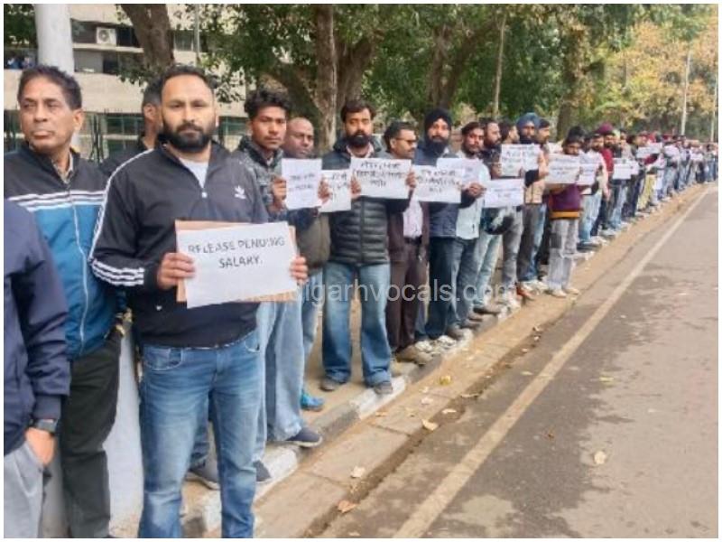 चंडीगढ़ न्यूज डेस्क: चंडीगढ़ में तीन महीने से वेतन न मिलने के कारण इंजीनियरिंग विभाग के आउटसोर्स वर्करों ने वीरवार को चंडीगढ़ सचिवालय के पास शांतिपूर्ण प्रदर्शन किया। यह विरोध कोआर्डिनेशन कमेटी ऑफ गवर्नमेंट एंड एमसी एम्पलाइज एंड वर्कर्स, यूटी चंडीगढ़ के बैनर तले किया गया, जहां प्रदर्शनकारियों ने हाथों में तख्तियां लेकर अपनी मांगें रखीं। वर्करों का कहना है कि बिना वेतन उनके लिए घर चलाना मुश्किल हो गया है, लेकिन प्रशासन उनकी शिकायतों पर ध्यान नहीं दे रहा।