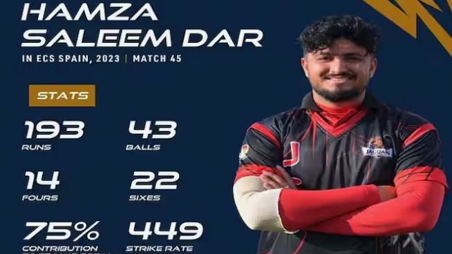 टी10 यूरोपियन क्रिकेट सीरीज (ईसीएस) में हमजा सलीम डार नाम के बल्लेबाज ने महज 43 गेंदों में 193 रन बनाकर इतिहास रच दिया है. वह अजेय रहे. उन्होंने अपनी तूफानी पारी में 22 छक्के लगाए. यह रिकॉर्ड 5 दिसंबर को कैटालुन्या जगुआर (सीजेजी) और सोहल हॉस्पिटलेट (एसओएच) के बीच मैच में बनाया गया था। टॉस जीतकर पहले बल्लेबाजी करते हुए सीजेजी ने 10 ओवर में 257 रन का शानदार स्कोर बनाया।