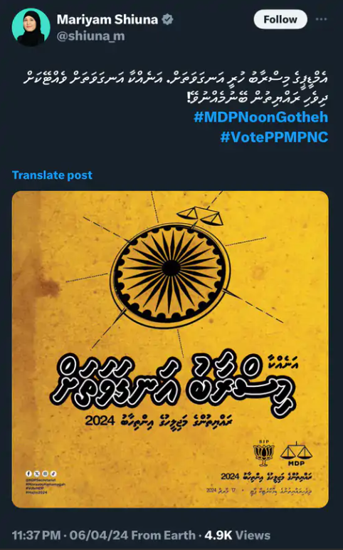 मुंबई, 08 अप्रैल, (न्यूज़ हेल्पलाइन)। मालदीव की बर्खास्त मंत्री मरियम शिउना ने विपक्षी मालदीवियन डेमोक्रेटिक पार्टी (MDP) को निशाना बनाने के लिए अशोक चक्र का इस्तेमाल किया। इससे जुड़ा एक पोस्ट सोशल मीडिया पर शेयर किया। विवाद होने के बाद मरियम ने इसे हटा दिया और माफी मांगी। दरअसल, शिउना ने MDP पर निशाना साधने के लिए X पर एक फोटो शेयर की थी। इसमें MDP के कैंपेन पोस्टर पर तिरंगे का अशोक चक्र और भारत की सत्तारूढ़ भारतीय जनता पार्टी (BJP) का चुनाव चिन्ह कमल का फूल लगाया गया था। पोस्ट में मरियम ने लिखा, MDP रास्ता भटक रही है। मालदीव के लोग उनके साथ गलत रास्ते पर नहीं जाना चाहते।