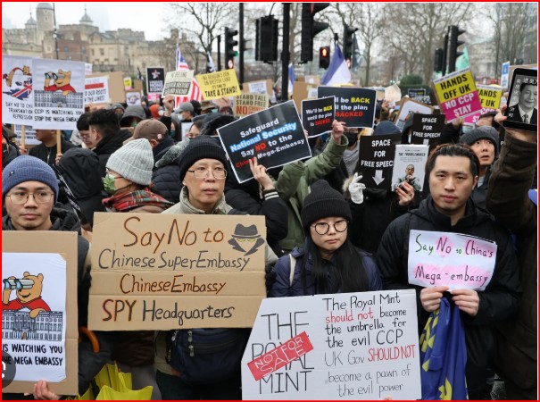 ब्रिटेन की मीडिया रिपोर्टों के अनुसार, प्रदर्शनकारी एक बहुत बड़े नए दूतावास के खिलाफ अपना विरोध दर्ज कराना चाहते थे, जिसके बारे में उन्हें डर है कि अगर इसे यूरोप में चीन के सबसे बड़े राजनयिक मिशनों में से एक के रूप में आगे बढ़ने की अनुमति दी जाती है तो इसका इस्तेमाल "जासूसी केंद्र" के रूप में किया जा सकता है। जेनरिक ने सभा को बताया, "हम नहीं चाहते कि हमारे पीछे यह महान ऐतिहासिक इमारत - टॉवर ऑफ़ लंदन की छाया में - चीनी सामुदायिक पार्टी का मेगा दूतावास बन जाए।" "यह गलत जगह है।