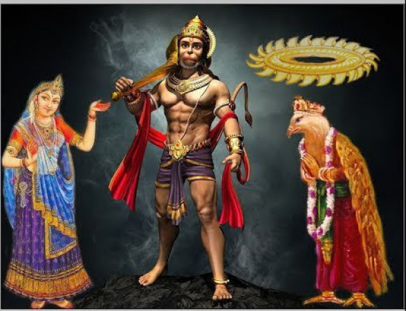 इसके विपरीत, गरुड़ हनुमान जी के पास पहुंचे और उन्हें भगवान का संदेश दिया। वह उन्हें सूचित करता है कि भगवान राम, वानर राजा, माता सीता के साथ द्वारका में उनसे मिलने का बेसब्री से इंतजार कर रहे हैं। तुरन्त मेरे साथ आओ, मैं तुम्हें अपनी पीठ पर बैठाकर शीघ्र ही वहाँ ले चलूँगा। हनुमान जी ने उनसे कहा कि आप आ रहे हैं. गरुड़ ने मन में सोचा कि उनकी वृद्धावस्था को देखते हुए हनुमान जी जल्दी कैसे आएँगे। गरुड़ ने हनुमान जी का अनुरोध स्वीकार कर द्वारका की ओर उड़ान भरी। हालाँकि, महल में प्रवेश करते ही गरुड़ भ्रमित हो गए और होश खो बैठे। हनुमान गरुड़ से पहले महल में पहुँच गये और उनके सामने बैठ गये। यह देखकर गरुड़ लज्जित हुए और उन्होंने अपना सिर झुका लिया।