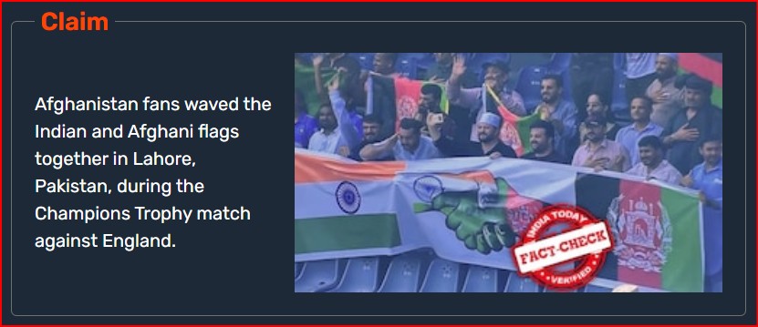 तथ्य जाँच: क्या अफ़गानिस्तान के प्रशंसकों ने इंग्लैंड के खिलाफ़ मैच के दौरान लाहौर में भारतीय ध्वज थामा था?
