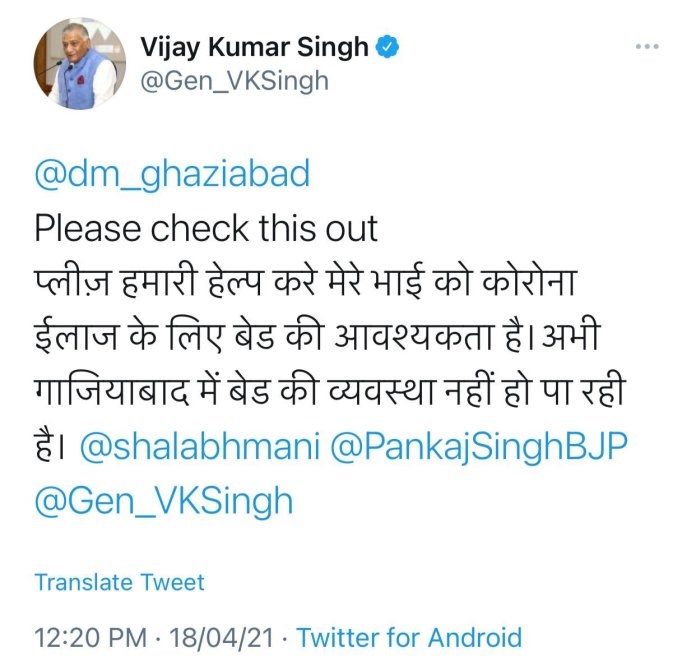 गाजियाबाद के भाजपा सांसद और पूर्व सेना प्रमुख वीके सिंह का एक ट्वीट कोरोना महामारी की दूसरी लहर के बीच वायरल हो रहा है। ट्वीट के साथ दावा किया जा रहा है कि वीके सिंह ने अपने भाई के लिए बेड उपलब्ध कराने के लिए गुहार लगाई। तहसीन पूनावाला जैसे कई ट्विटर यूजर्स ने केंद्रीय मंत्री के ट्वीट के स्क्रीनशॉट को शेयर करते हुए लिखा कि वीके सिंह अपने भाई के लिए हॉस्पिटल में बेड उपलब्ध कराने की मांग कर रहे हैं। वीके सिंह का ट्वीट गाजियाबाद के जिला मजिस्ट्रेट को टैग करते हुए लिखा गया कृपया इसे देखें। सोशल मीडिया यूजर्स ने वीके सिंह का ट्वीट शेयर करते हुए ये बताने की कोशिश की कि गाजियाबाद में कोरोना की कोशिश की कि गाजियाबाद में कोरोना की क्या स्थिति है। एक सांसद और पूर्व सेना प्रमुख को अपने कोविड संक्रमित भाई को हॉस्पिटल में बेड नहीं मिल रहा है। वे ट्विटर पर मदद मांग रहे हैं। वायरल पोस्ट की पड़ताल करने पर पाया गया कि वीके सिंह ने अपने भाई के लिए ट्वीट नहीं किया था। मीडिया संस्थान में भी इस बात की पुष्टि सांसद ने की | १८ अप्रैल को वीके सिंह ने ट्वीट पोस्ट किया था लेकिन बाद में इसे हटा दिया। इसके बाद उन्होंने एक और पोस्ट किया और स्पष्ट किया कि उन्होंने गाजियाबाद डीएम का ध्यान आकर्षित करने के लिए ट्वीट किया था ताकि जरूरतमंदों तक मदद पहुंच सके। वीके सिंह के नाम पर वायरल हो रही पोस्ट गलत है।