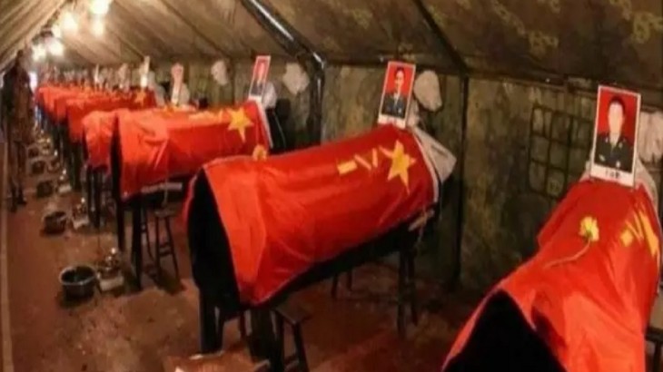 इस मैसेज में 20 जवानों के शहीद होने का दावा किया गया है। इस स्क्रीनशॉट में दावा किया जा रहा है कि भारत और चीन के बीच झड़प में चीन के 50 सैनिक घायल हुए हैं। वहीं 20 की मौत हो चुकी है। इन ताबूतों को व्यवस्थित तरीके से रखा जाता है। ये ताबूत चीन के झंडे की तरह लाल कपड़े से ढके होते हैं। इन सभी के पास एक फूल और संबंधित सैनिक की तस्वीर है। कहा जा रहा है कि ये ताबूत चीनी सैनिकों के हैं।