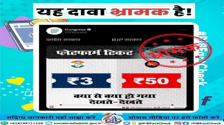 दोस्तों, आजकल आए दिन सोशल मीडिया पर भ्रामक दावे किए जा रहे हैं जिसके कारण उनको काफी बढ़ावा भी मिलता हैं । इसी बीच आजकल एक मैसेज काफी वायरल हो रहा है जिसमें कहा जा रहा है कि, भारतीय रेलवे के प्लेटफॉर्म टिकट की कीमत 50 रुपये हो गई है और इतना ही नहीं इस संदेश में कांग्रेस सरकार और भाजपा सरकार के कार्यकाल की तुलना भी की जा रही हैं । जब पीआईबी फैक्ट चेक टीम ने इस संदेश को अपने ट्विटर हैंडल पर शेयर किया हैं जिससे पता चलता है कि, कांग्रेस के कार्यकाल में टिकट तीन रुपये हुआ करता था, जो अब 50 रुपये है । मगर जब पीआईबी की फैक्ट चेक टीम इस मैसेज की सच्चाई का पता लगाया तो उन्होने कहा कि ये मैसेज पूरी तरह है फेक हैं और इस पर किसी को विश्वास नहीं करना चाहिए ।