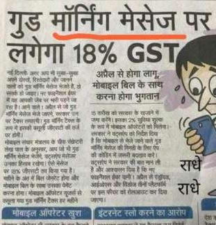 जिसमें इस अखबार की कटिंग की सच्चाई बताई गई थी.'गुड मॉर्निंग मैसेज पर 18% जीएसटी का दावा करने वाली खबर का वायरल सच।' बताया जाता है कि 2 मार्च 2018 को दिल्ली से प्रकाशित नवभारत टाइम्स अखबार के संस्करण में पहले पन्ने पर छपी यह पहली खबर थी. दरअसल, यह खबर 2 मार्च 2018 को होली पर 'बुरा न मानो होली है' की तर्ज पर व्यंग्यात्मक रूप में जारी की गई थी, जो देखते ही देखते वायरल हो गई।