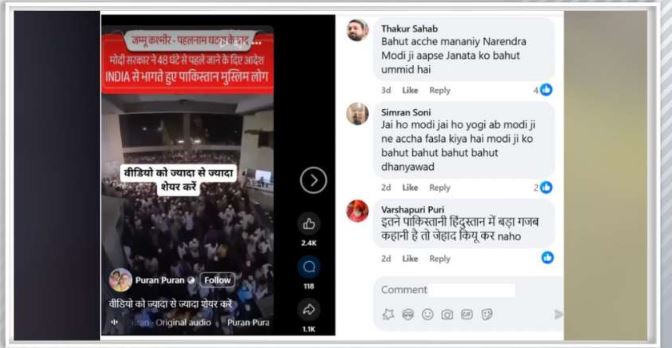 सोशल मीडिया पर एक वीडियो शेयर किया गया, जिसमें दावा किया गया कि मोदी सरकार के आदेश के बाद भारत से पाकिस्तानी लोग भाग रहे हैं। इस वीडियो में दिखाए गए लोगों को पाकिस्तानियों के रूप में पहचाना गया, और यह आरोप लगाया गया कि पहलगाम आतंकी हमले के बाद पाकिस्तानी मुस्लिम लोग भारत से भाग रहे हैं। इसके साथ ही एक कैप्शन भी डाला गया था, जिसमें यह कहा गया था कि "मोदी सरकार के आदेश पर पाकिस्तानियों का पलायन"