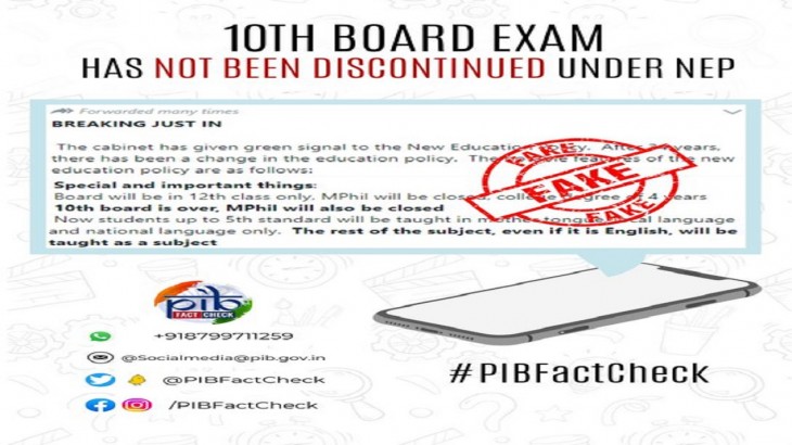 इस बात को हम सब जानते है कि, कोरोना काल में बोर्ड परीक्षाओं को लेकर कई बदलाव किए गए थें मगर उसके बाद से सोशल मीडिया पर इन परीक्षाओं को लेकर कई तरह की जानकारियां वायरल हो रही हैं । कुछ ऐसी की जानकारी अभी भी सोशल मीडिया पर वायरल हो रही हैं जिसमें दावा किया गया जा रहा है कि, नई शिक्षा नीति के तहत तीन साल बाद कोई बोर्ड परीक्षा नहीं होगी । सिर्फ 12वीं बोर्ड की परीक्षाएं होंगी, जिसके बाद सोशल मीडिया पर 10वीं की परीक्षा को लेकर तरह-तरह की प्रतिक्रियाएं सामने आ रही है । छात्र लगातार पूछ रहे हैं कि क्या यह जानकारी सही है। मगर जब इस बात की सच्चाई का पता पीआईबी फैक्ट चेक टीम ने लगाया, तो उन्होंने कहा कि, यह मैसेज पूरी तरह से फेक है । इसके आगे उन्होंने इस संदेश को अपने पोर्टल पर भी शेयर किया है । साथ ही मैसेज पर फर्जी मुहर भी लगाई गई है।