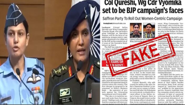 कर्नल सोफिया कुरैशी और विंग कमांडर व्योमिका को लेकर जो खबर वायरल हो रही है कि वे भाजपा के प्रचार अभियान का चेहरा बनेंगी, वह पूरी तरह झूठ और भ्रामक है। टाइम्स ऑफ इंडिया की जिस रिपोर्ट की कटिंग शेयर की जा रही है, वह एडिटेड और फर्जी है। भाजपा ने स्वयं इस खबर को खारिज कर दिया है और इसे फेक न्यूज करार दिया है।