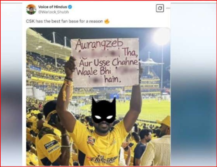 हाल ही में सोशल मीडिया पर एक तस्वीर वायरल हो रही है, जिसमें दावा किया जा रहा है कि चेन्नई सुपर किंग्स (CSK) के एक प्रशंसक ने स्टेडियम में औरंगजेब के खिलाफ पोस्टर लहराया। यह दावा तेजी से फैल रहा है और विभिन्न प्लेटफॉर्म्स पर चर्चा का विषय बना हुआ है। इस लेख में, हम इस दावे की सच्चाई की जांच करेंगे और तथ्यात्मक जानकारी प्रस्तुत करेंगे।​