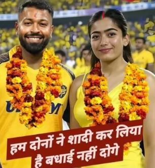 हाल ही में सोशल मीडिया पर एक तस्वीर तेजी से वायरल हो रही है, जिसमें हार्दिक पांड्या और रश्मिका मंदाना को फूलों की माला पहने और रश्मिका की मांग में सिंदूर लगाए हुए देखा जा सकता है। इस फोटो के साथ दावा किया जा रहा है कि दोनों ने शादी कर ली है। इंस्टाग्राम पर एक यूजर ने यह तस्वीर पोस्ट करते हुए लिखा, "हार्दिक पांड्या और रश्मिका मंडाना ने शादी कर लिया है, बधाई नहीं दोगे?"