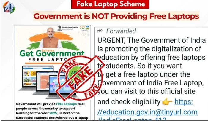 "सरकार की ओर से छात्रों को मुफ्त लैपटॉप देने की कोई भी योजना नहीं चलाई जा रही है। वायरल मैसेज पूरी तरह से फर्जी है और इसका लिंक भी धोखाधड़ीपूर्ण है।"