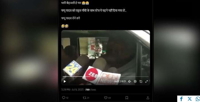 एक सोशल मीडिया यूजर, जो खुद को 'बिहारी बाबू' नाम से एक्स (पूर्व में ट्विटर) पर परिचित कराता है, ने पप्पू यादव का एक वीडियो शेयर किया। वीडियो के साथ लिखा गया – “भारी बेइज्जती है यार, पप्पू यादव को राहुल गांधी के साथ स्टेज पे चढ़ने नहीं दिया गया तो पप्पू यादव रोने लगे।” इस दावे के साथ वीडियो को हजारों बार रीट्वीट और शेयर किया गया, जिससे यह तेजी से वायरल हो गया।