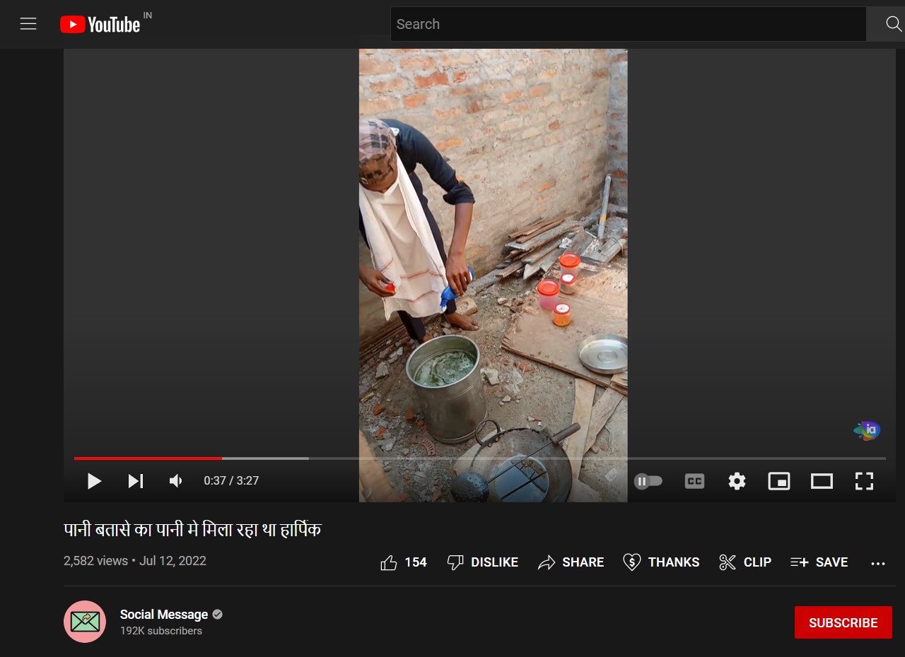 दोस्तों, गोल गप्पे में इस्तेमाल होने वाले पानी में शौचालय की सफाई के तरल को मिलाने का एक वीडियो इन दिनों सोशल मीडिया पर काफी वायरल हो रहा हैं मगर इस वीडियों में कितनी सच्चाई हैं और कितना झूठ हैं आज हम आपको बताएंगे । आपकी जानकारी के लिए बता दें कि, इस वायरल वीडियो में दिख रहा है कि एक आदमी जिसका चेहरा ढका हुआ है, उसे रंगे हाथ टॉयलेट क्लीनर के तरल को पानी में मिलाते हुए पकड़ा जाता है और उसके आसपास गोल गप्पे बनाने के लिए इस्तेमाल की जाने वाली अन्य सामग्री होती है । जब वीडियो शूट करने वाले लोग उस आदमी से पूछताछ करते हैं तो वो बताता हैं कि, उसका नाम 'जुबैर' है। इसके आगे आपको बता दें कि, इस वायरल वीडियो को कैप्शन के साथ शेयर किया जा रहा है, जिसका अनुवाद है, "जुबैर नाम का एक जिहादी पानी पुरी के पानी में हार्पिक मिला रहा हैं और लोगों को खिला रहा है । अगर आप जिहादियों से कुछ भी खरीदते हैं, तो आपकी जान जाने का खतरा होगा।"