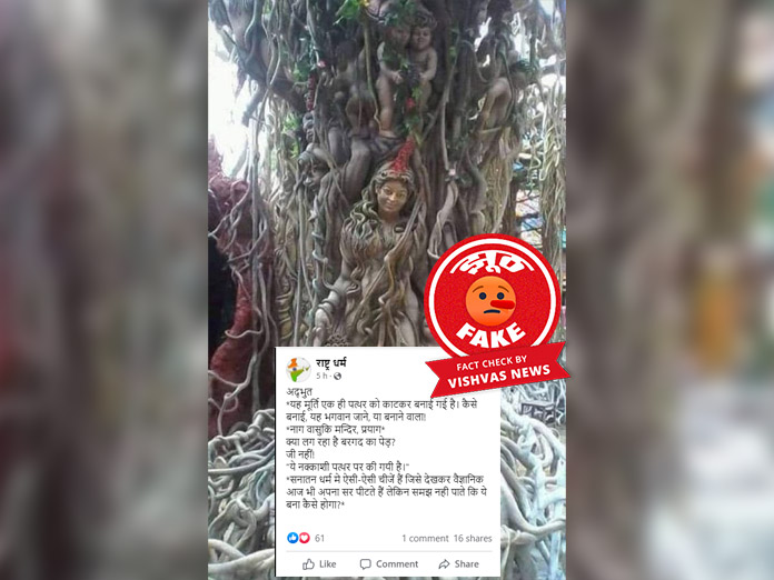 आजकल सोशल मीडिया पर एक तस्वीर वायरल हो रही है, जिसके साथ ये दावा किया जा रहा है कि, यह तस्वीर प्रयागराज के नाग वासुकी मंदिर की है और तस्वीर में दिखाई दे रही मूर्ति एक ही पत्थर से बनाई गई हैं । मगज जब हमने इसकी सच्चाई का पता लगाया तो पाया कि ये तस्वीर और खबर पूरी तरह से फर्जी हैं । वायरल तस्वीर प्रयागराज के नाग वासुकी मंदिर की नहीं, बल्कि कर्नाटक के उत्सव रॉक गार्डन में एक कलात्मक बरगद के पेड़ की है, जिसको झूठे दावे के साथ पेश किया जा रहा हैं ।