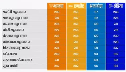 लोकसभा चुनाव 2024 के मद्देनजर सोशल मीडिया पर एक ग्राफिक वायरल हो रहा है. जिसमें सट्टा बाजार का हवाला देते हुए एनडीए और भारत गठबंधन के बीच बड़े टकराव की संभावना जताई गई है. जिसमें राजस्थान के फलौदी समेत विभिन्न सट्टा बाजारों को लेकर किए गए अनुमान देखे जा सकते हैं. अनुमान के मुताबिक लोकसभा चुनाव में बीजेपी और एनडीए की सीटों में गिरावट आ रही है, जबकि कांग्रेस के नेतृत्व वाला भारत गठबंधन बढ़त का दावा कर रहा है.