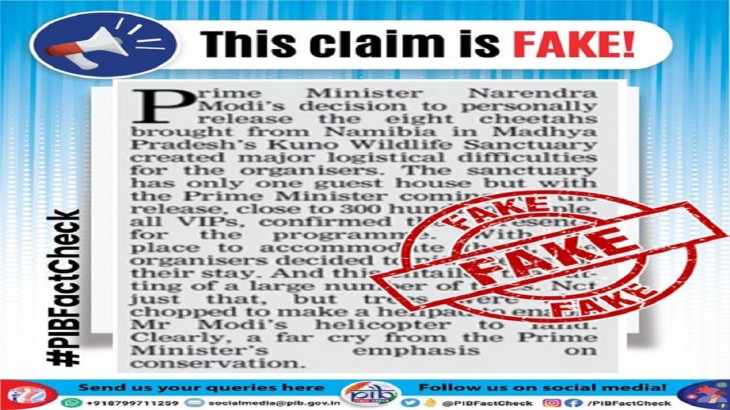 Fact Check News Desk !!! हाल ही में प्रधानमंत्री नरेंद्र मोदी द्वारा मध्य प्रदेश के कुनो वन्यजीव अभयारण्य में आठ चीतों को छोड़ा गया था। इस दौरान भव्य समारोह में बड़ी संख्या में मेहमान पहुंचे। उनका जोरदार स्वागत किया गया। इस बीच दावा किया जा रहा है कि प्रधानमंत्री के दौरे को समायोजित करने के लिए वन्यजीव अभयारण्य में बड़ी संख्या में पेड़ काटे गए। गौरतलब है कि करीब 70 साल के इंतजार के बाद भारत में 8 नए चीतों को छोड़ा गया। इन चीतों का कूनो नेशनल पार्क में खुद पीएम नरेंद्र मोदी ने स्वागत किया था. पीएम मोदी ने अपने जन्मदिन पर देश को ये तोहफा दिया. पीआईबी की फैक्ट चेक टीम ने जब इस तथ्य की जांच की तो उन्होंने पाया कि यह मैसेज पूरी तरह से फर्जी है। कोई पेड़ नहीं काटे गए। मेहमानों के ठहरने की व्यवस्था सेसैपुरा एफआरएच और टूरिज्म जंगल लॉज में की गई थी। पीआईबी ने आम जनता से इस तरह के संदेशों को फॉरवर्ड न करने की अपील की है। इस तरह के मैसेज आम जनता में भ्रम फैलाने का काम करते हैं।